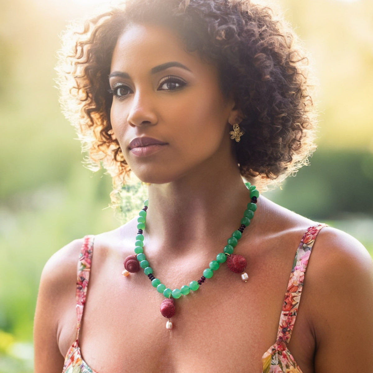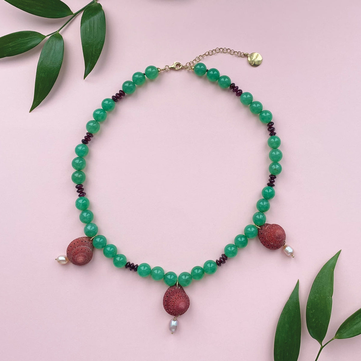 Expertly handcrafted from 18-karat gold-plated silver (1-micron thickness) and features natural chrysoprase stones, garnet, red shells, and pearls.