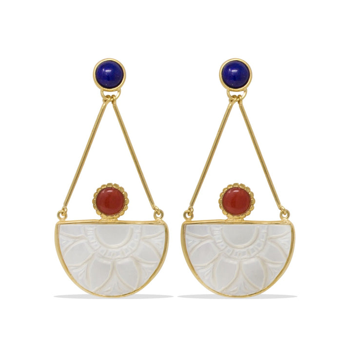 These earrings are cast from sterling silver with an 18-karat gold vermeil finish (1-micron thickness) and are set with hand-carved mother-of-pearl, red carnelian, and blue lapis cabochons. They are nickel-free.