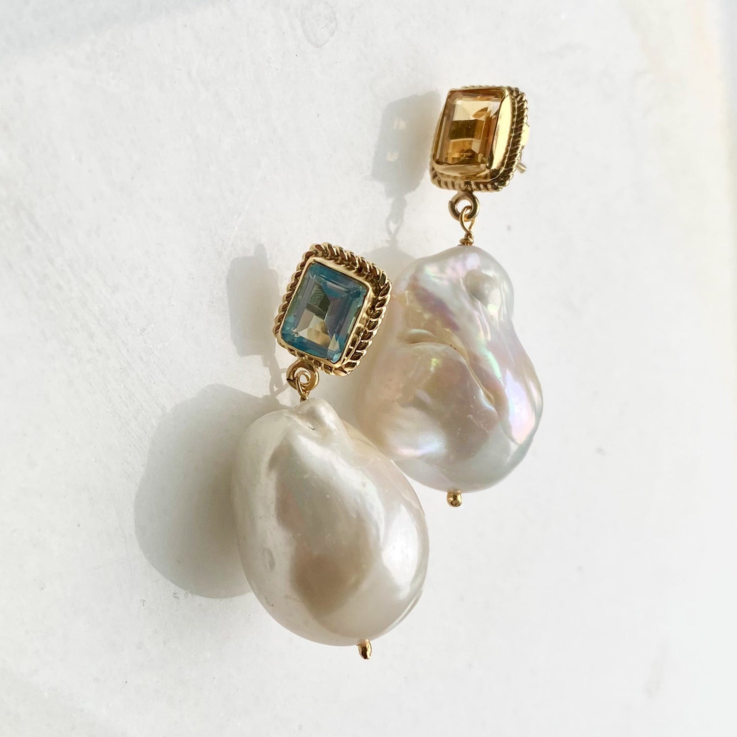 These earrings are cast from sterling silver with 24-karat gold vermeil (2.5-micron thickness) and feature natural yellow citrine gemstones and baroque pearls. They are handmade in Italy and nickel-free.