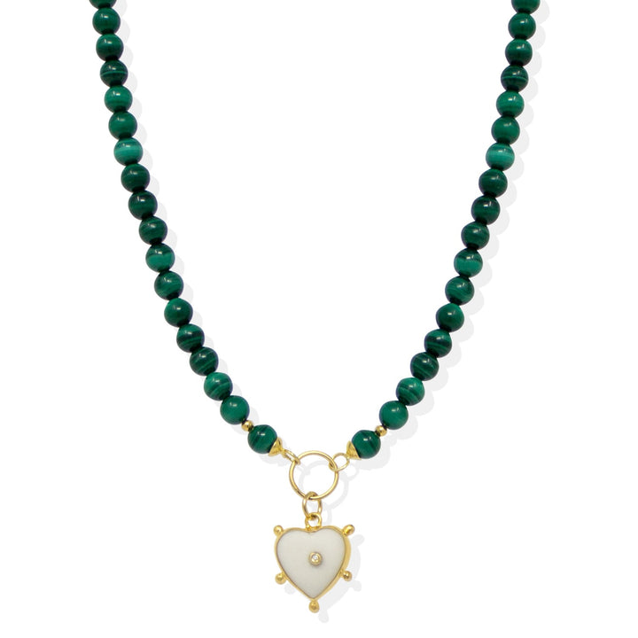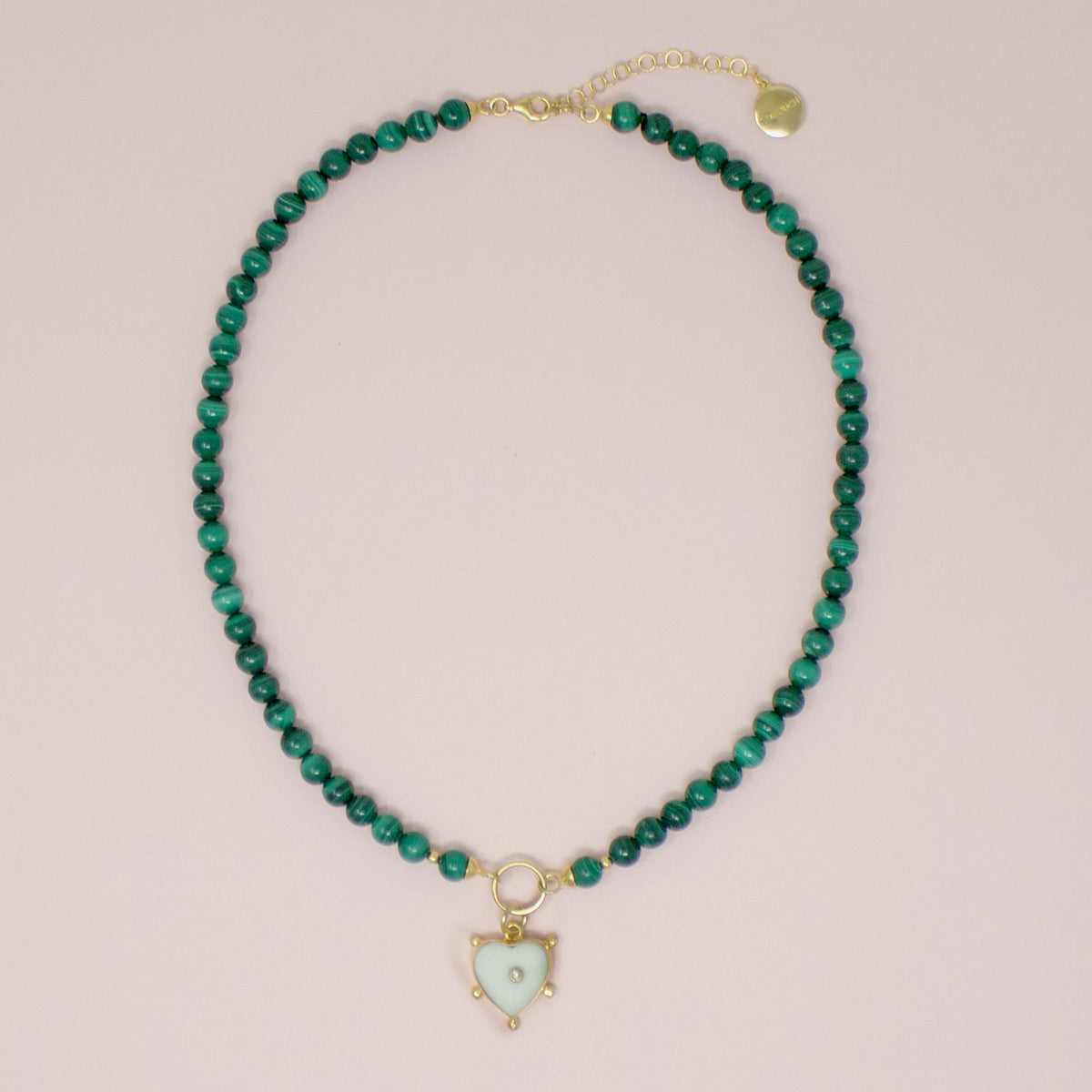 The Happy Heart Malachite Necklace by Vintouch Italy is a meaningful and charming piece. It features natural malachite beads, known as the stone of transformation and new beginnings. At its center, a delicate white porcelain heart pendant, handmade from jasperware, holds a sparkling lab-grown diamond. This necklace is a beautiful gift that symbolizes love and protection, radiating positive energy.
