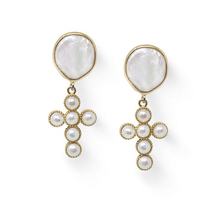 The Hope Gold-Plated Pearl Cross Earrings by Vintouch Italy are an artfully designed pair of earrings that are the "epitome of elegance." These earrings are made from 18k gold-plated silver and are balanced by a single baroque pearl and a delicate cross pendant adorned with lustrous freshwater pearls. They are a perfect accessory for any luxurious ensemble.