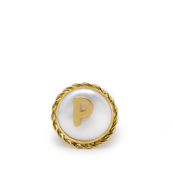 The Moonglow Gold-Plated Initial P Pearl Ring by Vintouch Italy is a unique and personalized ring. It is handmade from 24k gold-plated silver and features a luminous pearl topped with the letter 'P'. It's a perfect way to add a personal touch to your look or to honor someone special.