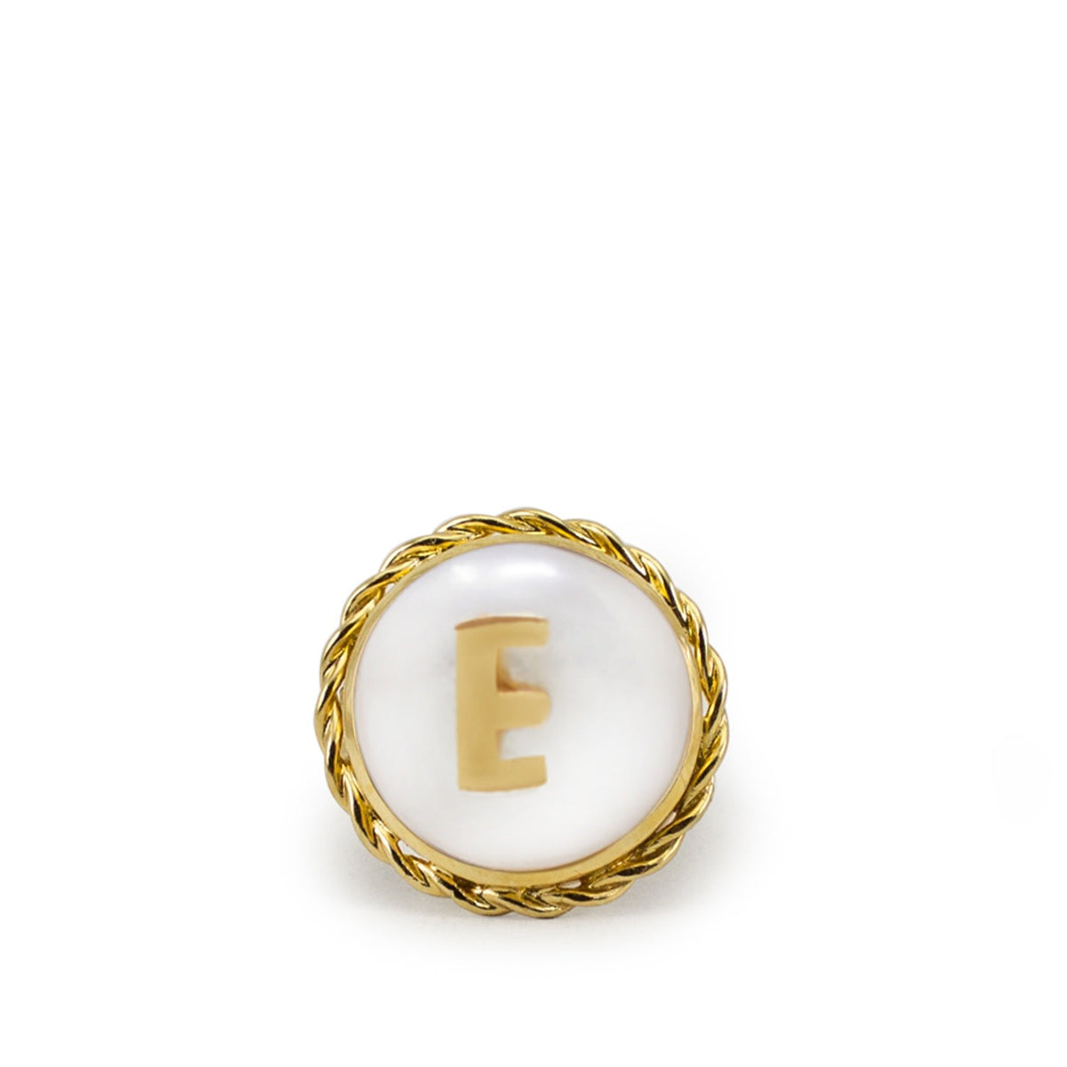 The Moonglow Gold-Plated Initial E Pearl Ring by Vintouch Italy is a unique and personalized ring. It is handmade from 24k gold-plated silver and features a luminous pearl topped with the letter 'E'. It's a perfect way to add a personal touch to your look or to honor someone special.