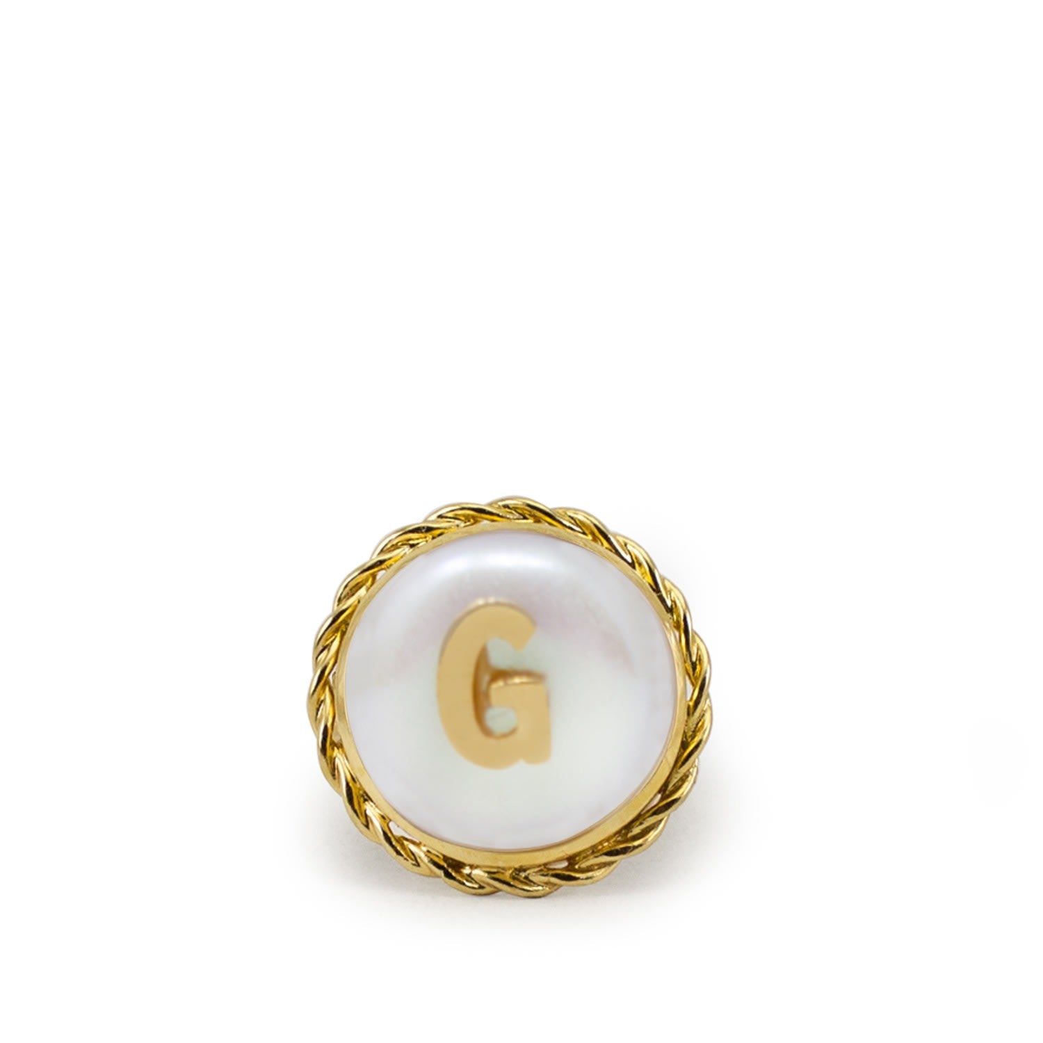 The Moonglow Gold-Plated Initial G Pearl Ring by Vintouch Italy is a unique and personalized ring. It is handmade from 24k gold-plated silver and features a luminous pearl topped with the letter 'G'. It's a perfect way to add a personal touch to your look or to honor someone special.