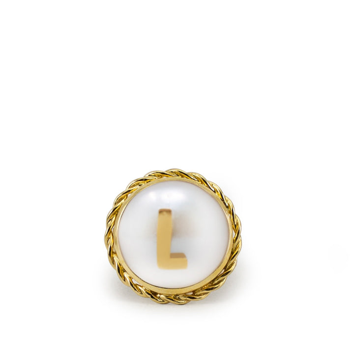 The Moonglow Gold-Plated Initial L Pearl Ring by Vintouch Italy is a unique and personalized ring. It is handmade from 24k gold-plated silver and features a luminous pearl topped with the letter 'L'. It's a perfect way to add a personal touch to your look or to honor someone special.