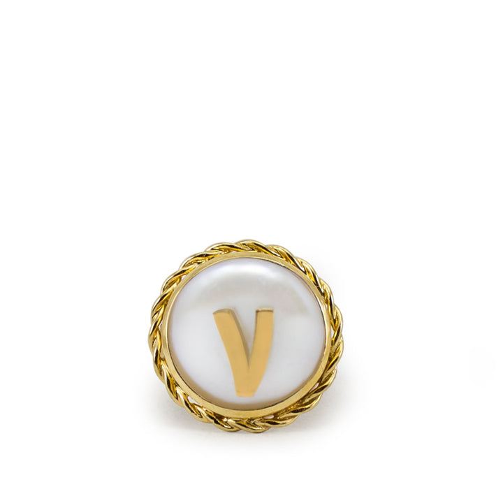 The Moonglow Gold-Plated Initial V Pearl Ring by Vintouch Italy is a unique and personalized ring. It is handmade from 24k gold-plated silver and features a luminous pearl topped with the letter 'V'. It's a perfect way to add a personal touch to your look or to honor someone special.