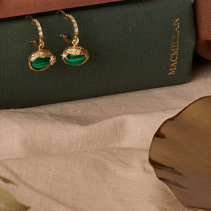These hoop earrings are handcrafted from 18-karat gold over sterling silver (1-micron thickness) with a 0.10-micron palladium plate. They feature dangling malachite and encrusted crystals. They are nickel-free and made in full compliance with UE Reach/Rohs directives.
