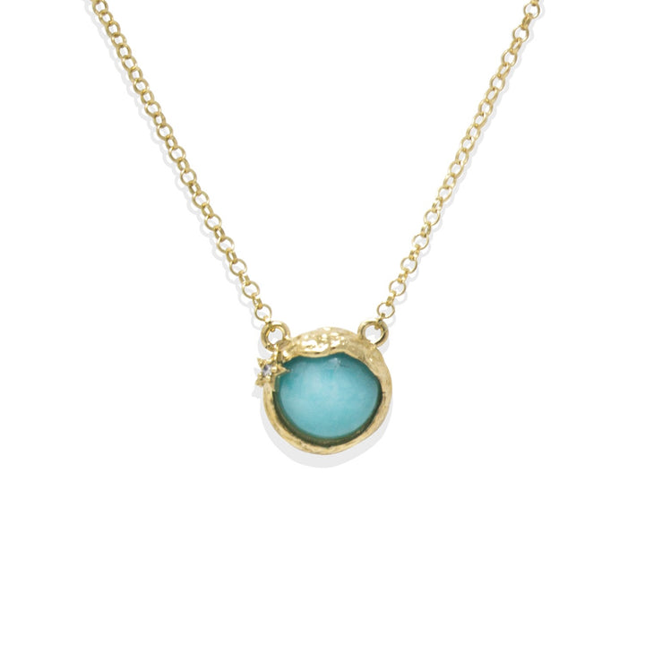 This necklace is handmade from 18-karat gold over sterling silver (1-micron thickness) with a 0.10-micron palladium plate. It features a vibrant amazonite and a crystal-encrusted star motif.