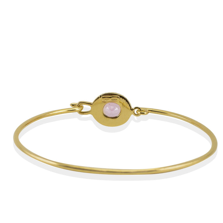 This cuff bracelet is handmade from 18-karat gold over sterling silver (1-micron thickness) and is centered with a 1.5-carat pink agate stone.