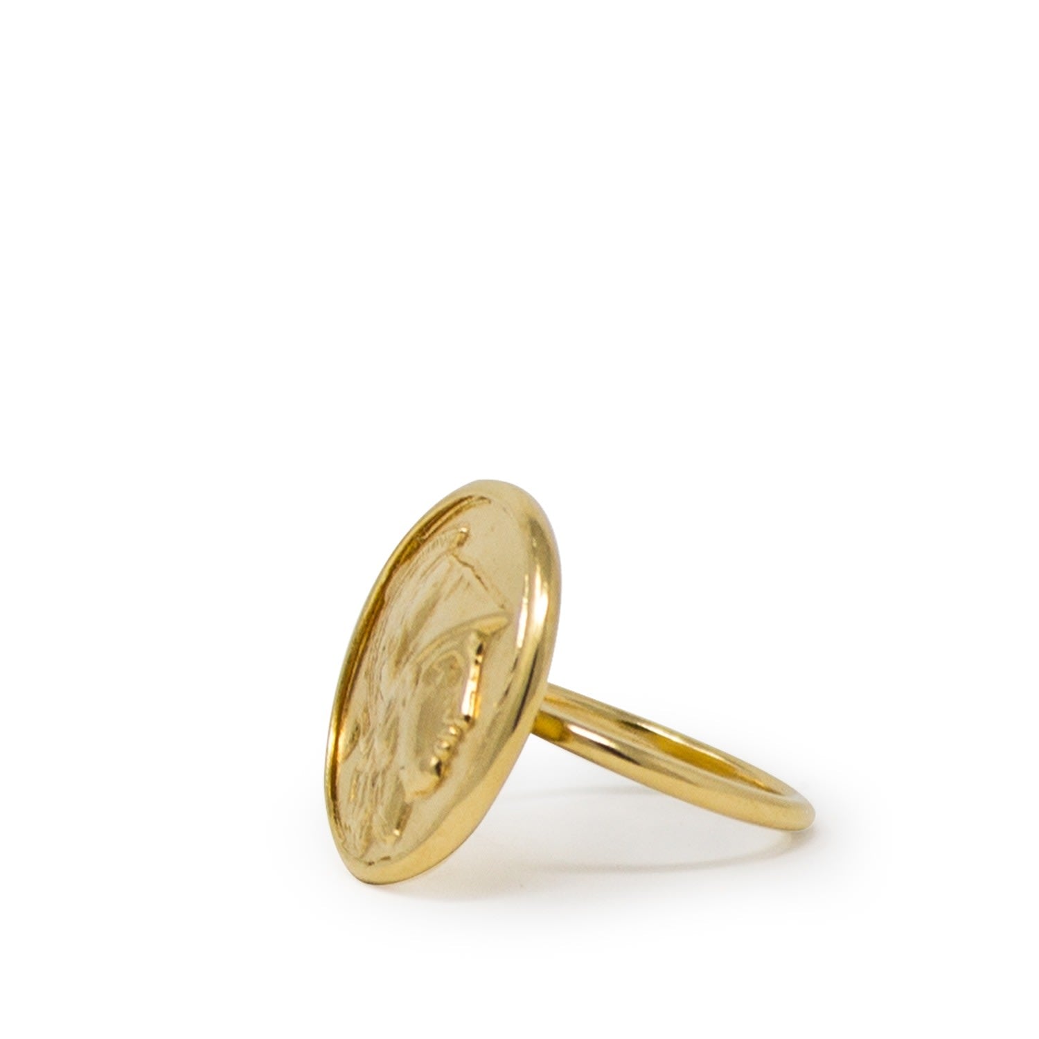 The Athena Gold-Plated Ring by Vintouch Italy is part of the brand's Roma collection, inspired by the Greco-Roman world. It features an 18-karat gold-plated silver band and an antique coin depicting Athena, the Greek goddess of wisdom. A silver ribbon wrapped around the coin adds a unique element to this timeless and meaningful piece.