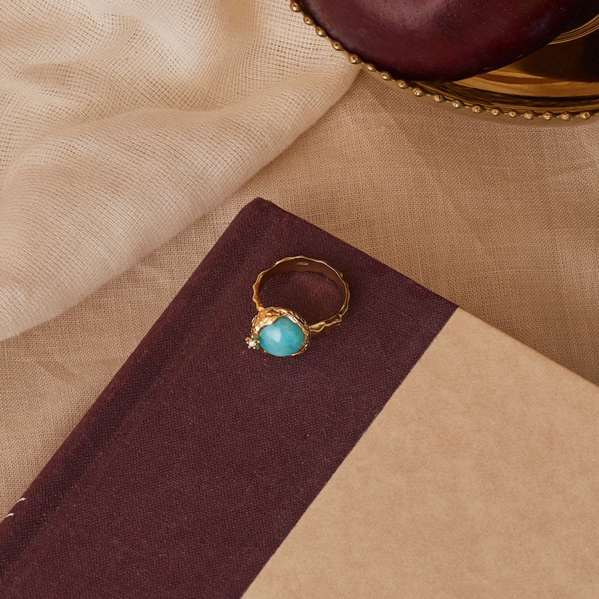 This ring is handcrafted from 18-karat gold-plated silver with an additional layer of palladium-plating for tarnish protection. It features a vibrant amazonite and a crystal-encrusted star motif.