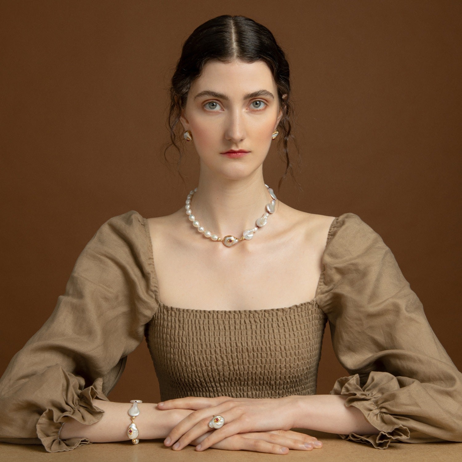 This The Eye Gold-Plated Pink Ruby & Pearl Statement Necklace by Vintouch Italy is an elevated and symbolic piece. It is strung with irregular pearls, garnet, and gold-plated beads, with a central pearl embellished with a ruby eye. Inspired by the Egyptian god Ra, the eye symbolizes good luck and protection, making this a beautiful personal talisman that blends modern aesthetics with natural materials.