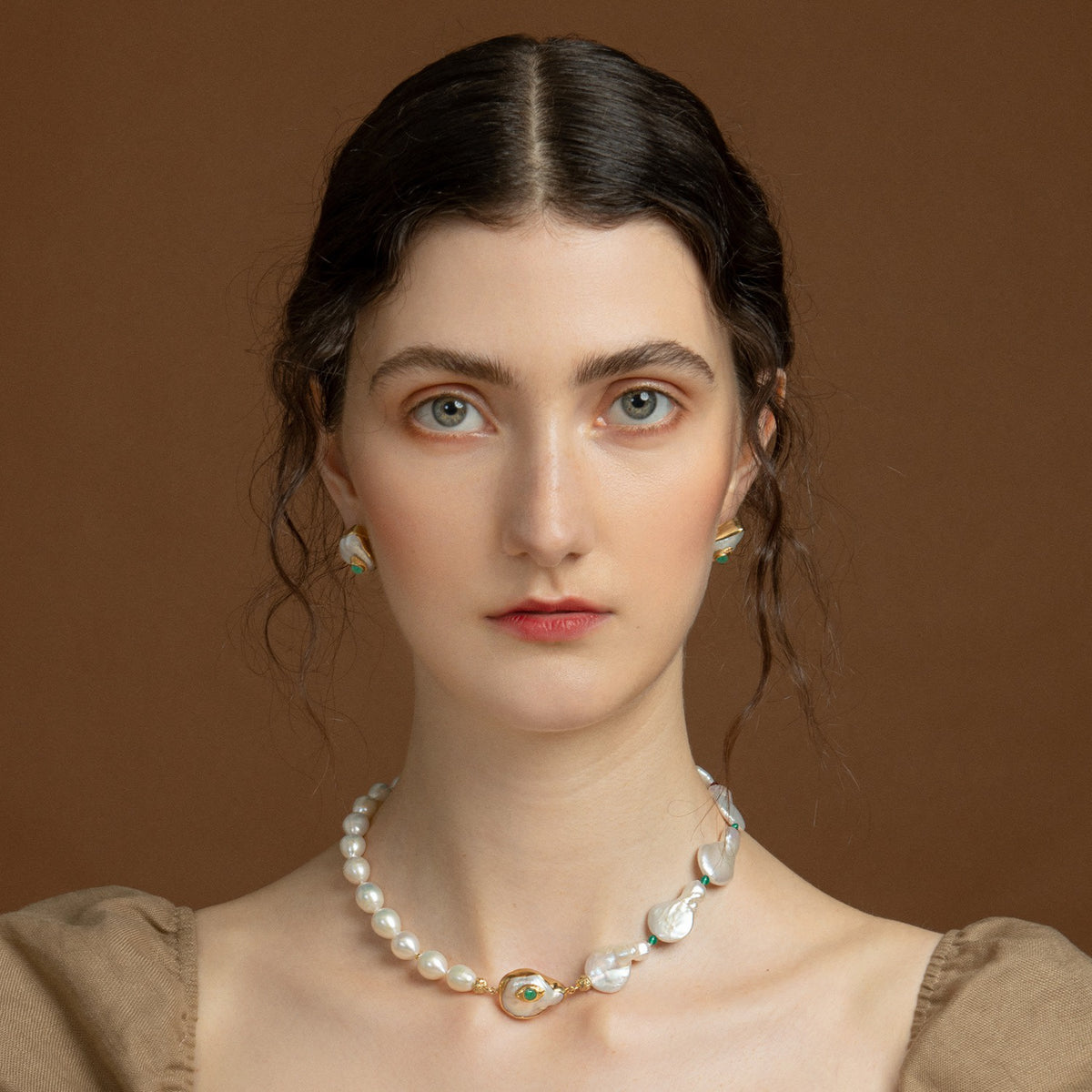 This necklace is cast from 18-karat gold over sterling silver with a 1-micron thickness. It features lustrous baroque pearls, dainty green agate beads, and a green emerald stone. It is made in compliance with UE Reach/Rohs directives and is nickel-free.