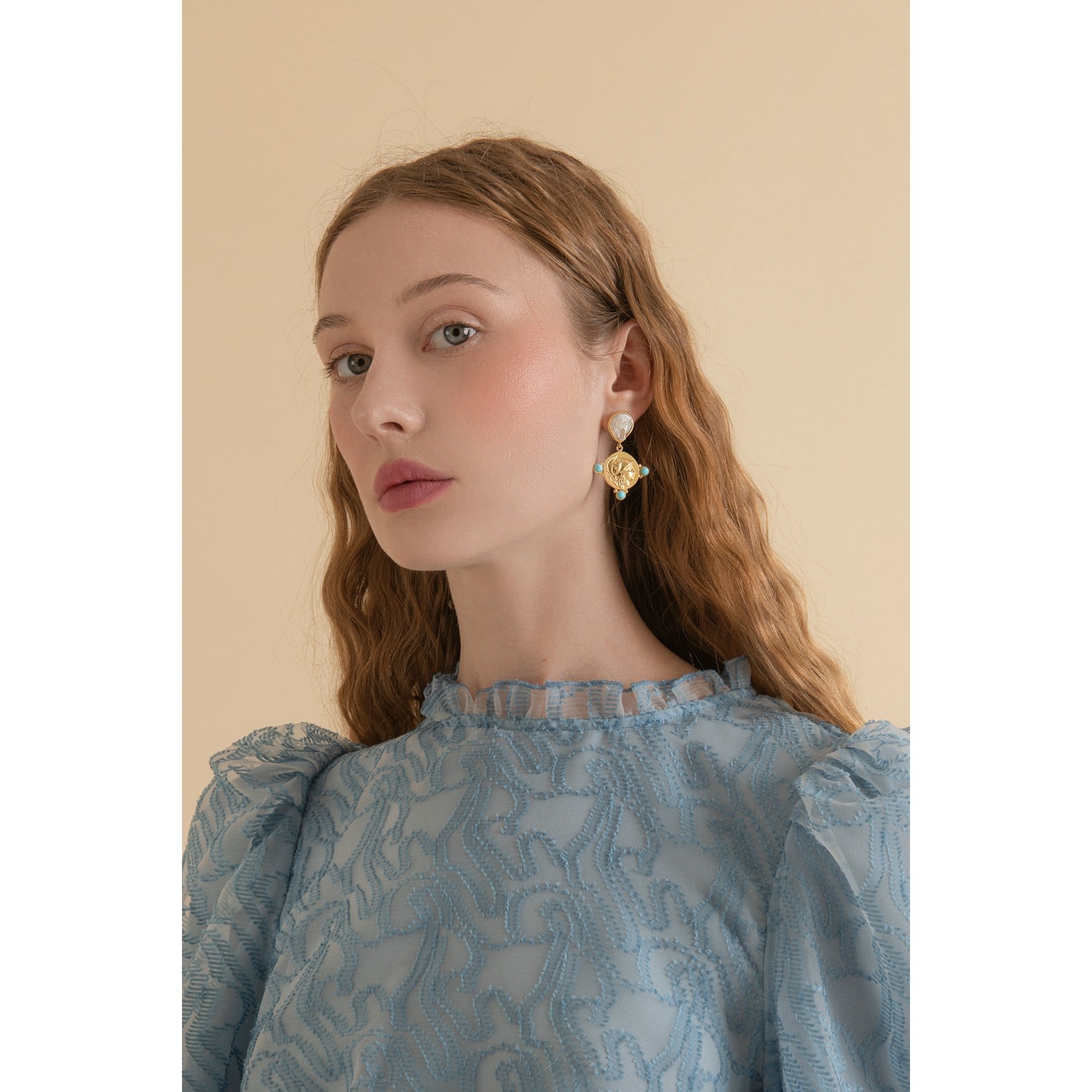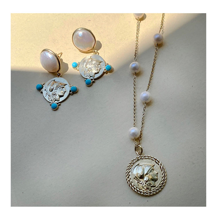 The Athena Pearl & Turquoise Drop Earrings by Vintouch Italy are a tribute to classical art and a reminder to draw inspiration from the past. Crafted from 18-karat gold-plated silver, these earrings feature antique coins depicting the Greek goddess Athena, along with irregularly beautiful baroque pearls and small turquoise cabochons. These unique drop earrings are a timeless and sophisticated accessory.