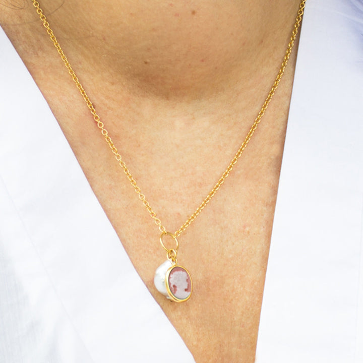 Handcrafted in Italy, this necklace is cast from 18-karat gold over sterling silver. It features a hand-carved porcelain mini cameo and a baroque freshwater pearl. It is also nickel-free.