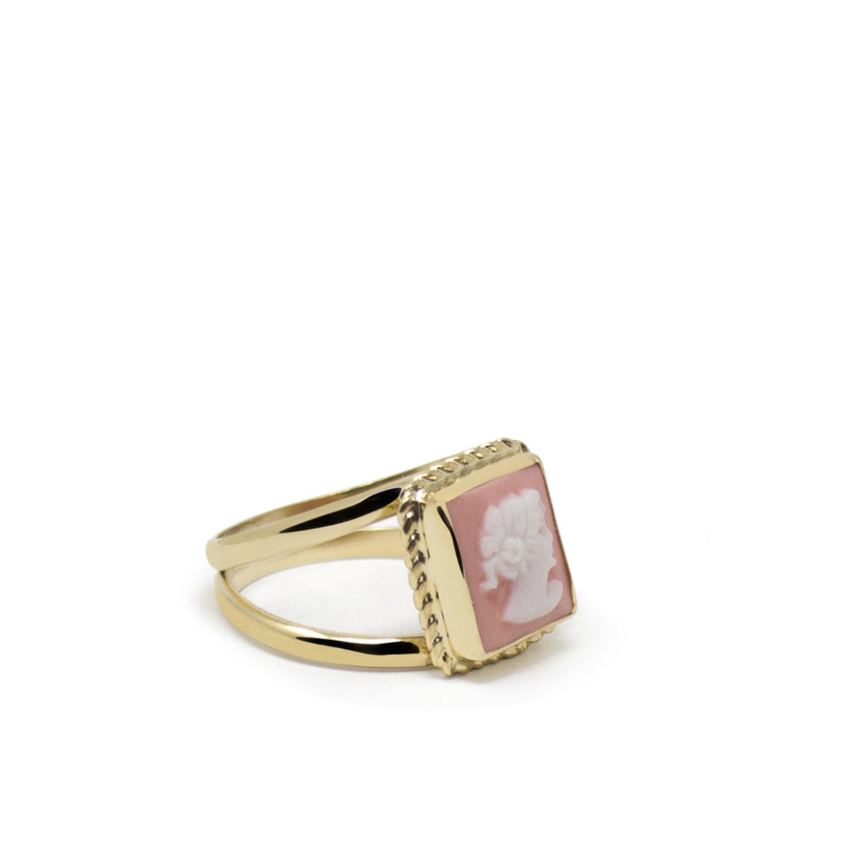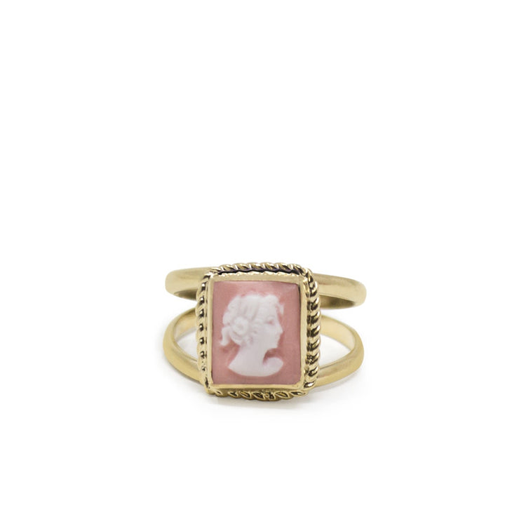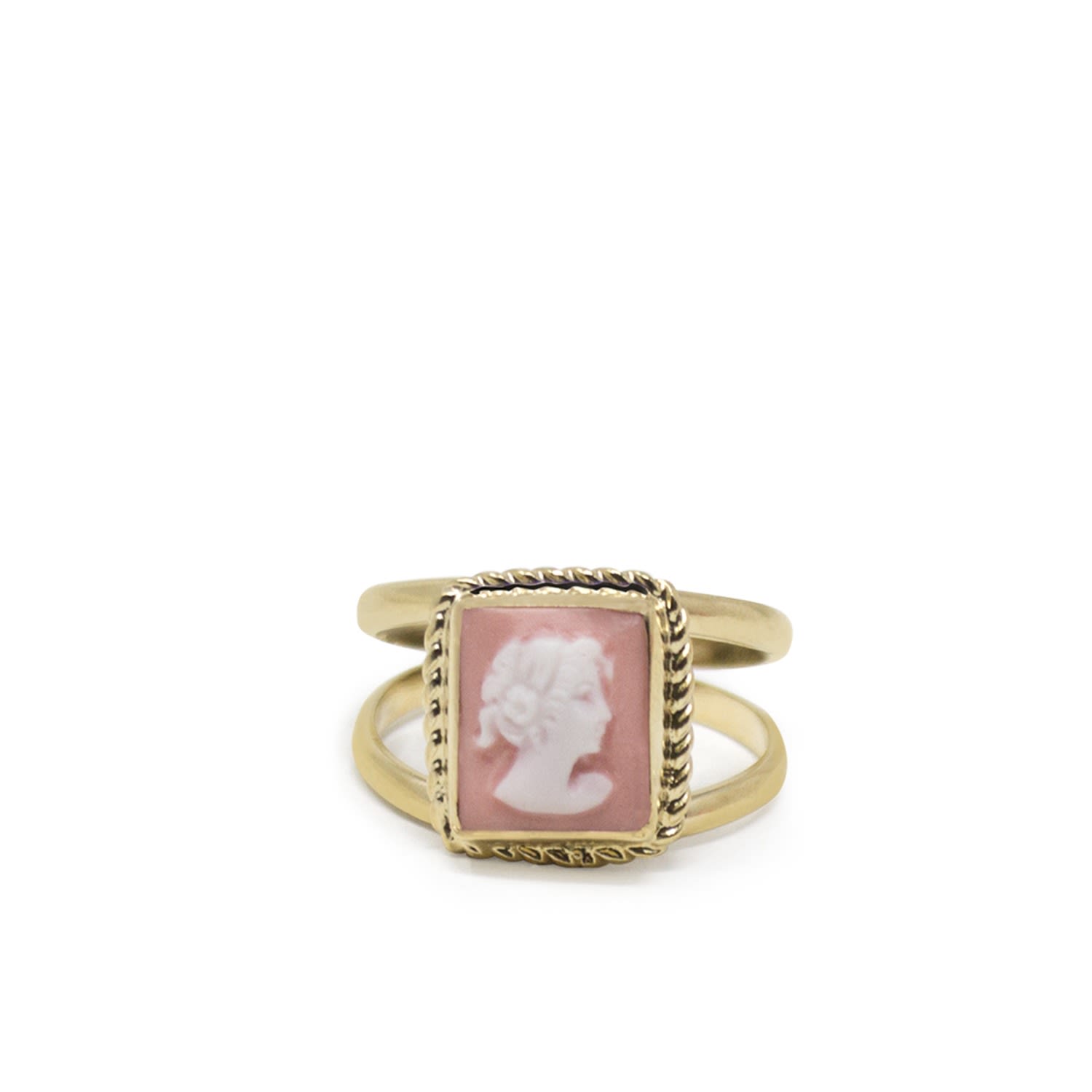 This The Beloved Gold-Plated Pink Cameo Ring by Vintouch Italy is a romantic and elegant piece inspired by iconic 19th-century designs. Each hand-carved porcelain cameo, depicting a woman's silhouette, is a unique work of art. This ring serves as a beautiful tribute to love and femininity, making it a perfect gift for a loved one or a special treat to yourself.