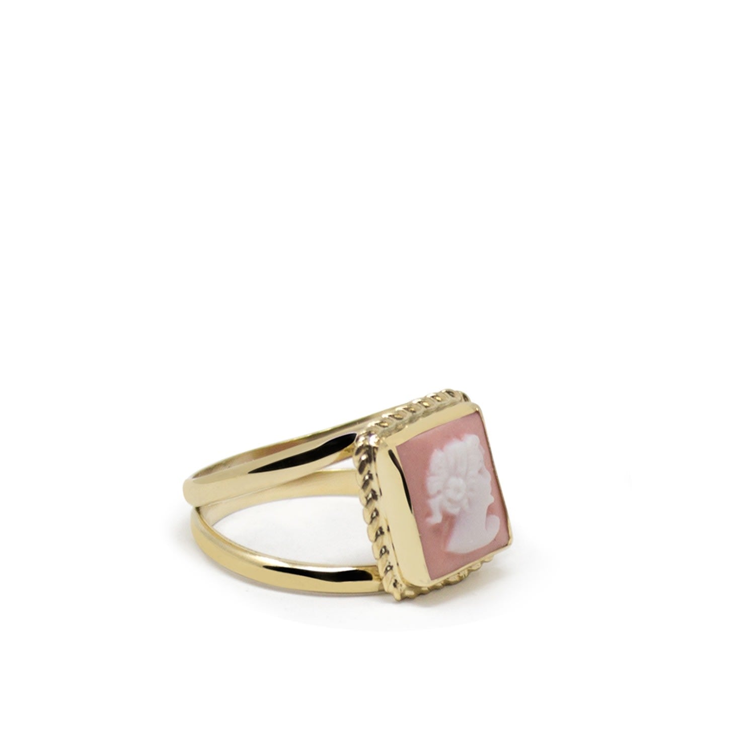 This ring is crafted from 18-karat gold-plated silver (1-micron thickness) with a palladium plate (0.10-micron thickness). The centerpiece is a hand-carved porcelain 'biscuit' cameo in pink. The piece is nickel-free and handmade in Italy.