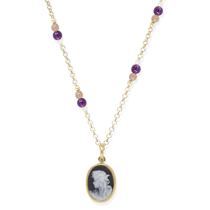 This necklace is handcrafted from 18-karat gold-plated sterling silver (1-micron thickness) with a palladium plate (0.10-micron thickness). It features a hand-carved black porcelain cameo and is strung with amethyst, pink labradorite, and freshwater pearl beads. The piece is nickel-free and handmade in Naples, Italy.