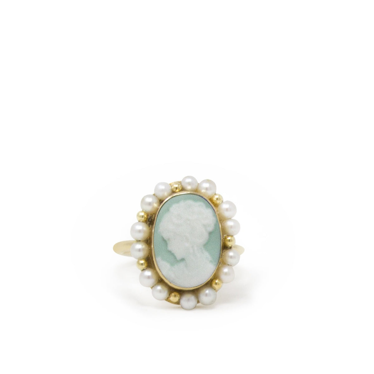This ring is handcrafted from 18-karat gold-plated silver (1 micron thickness) with a 0.10 micron palladium plate. It features a hand-carved porcelain green cameo and freshwater pearl beads. The piece is made in Torre del Greco, Italy.