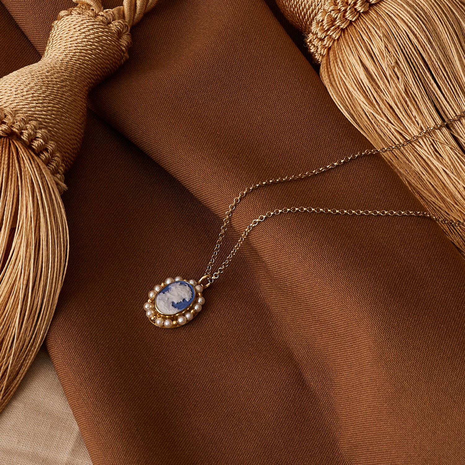 This Little Lovelies Gold-Plated Blue Cameo Pearly Necklace by Vintouch Italy is an elegant and simple necklace that's perfect for everyday wear. It features a classy, hand-carved blue porcelain cameo that is carefully handset in 18-karat gold-plated silver and wrapped in an array of lustrous freshwater pearls. This piece seamlessly combines traditional artistry with modern wearability, and can be worn with coordinating earrings and a ring for a complete look.