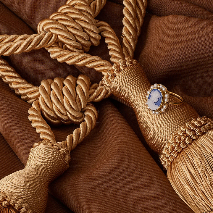 This Little Lovelies Gold-Plated Blue Cameo Pearly Ring by Vintouch Italy is a contemporary and beautiful ring from a collection that features hand-carved cameos and colorful gemstones. The ring is cast from 18-karat gold-plated silver and is topped with a porcelain cameo symbolizing love, all wrapped in dainty freshwater pearls. It's a versatile piece that can be worn alone or with coordinating jewelry for a cohesive and elegant look.
