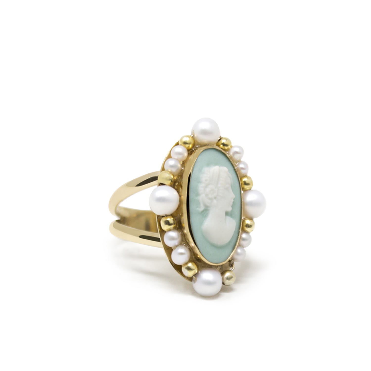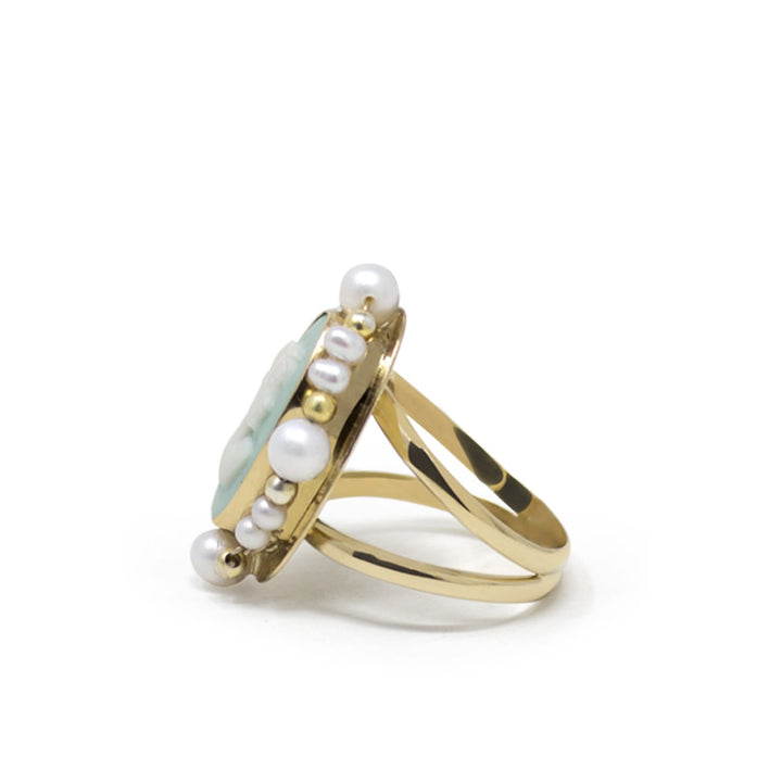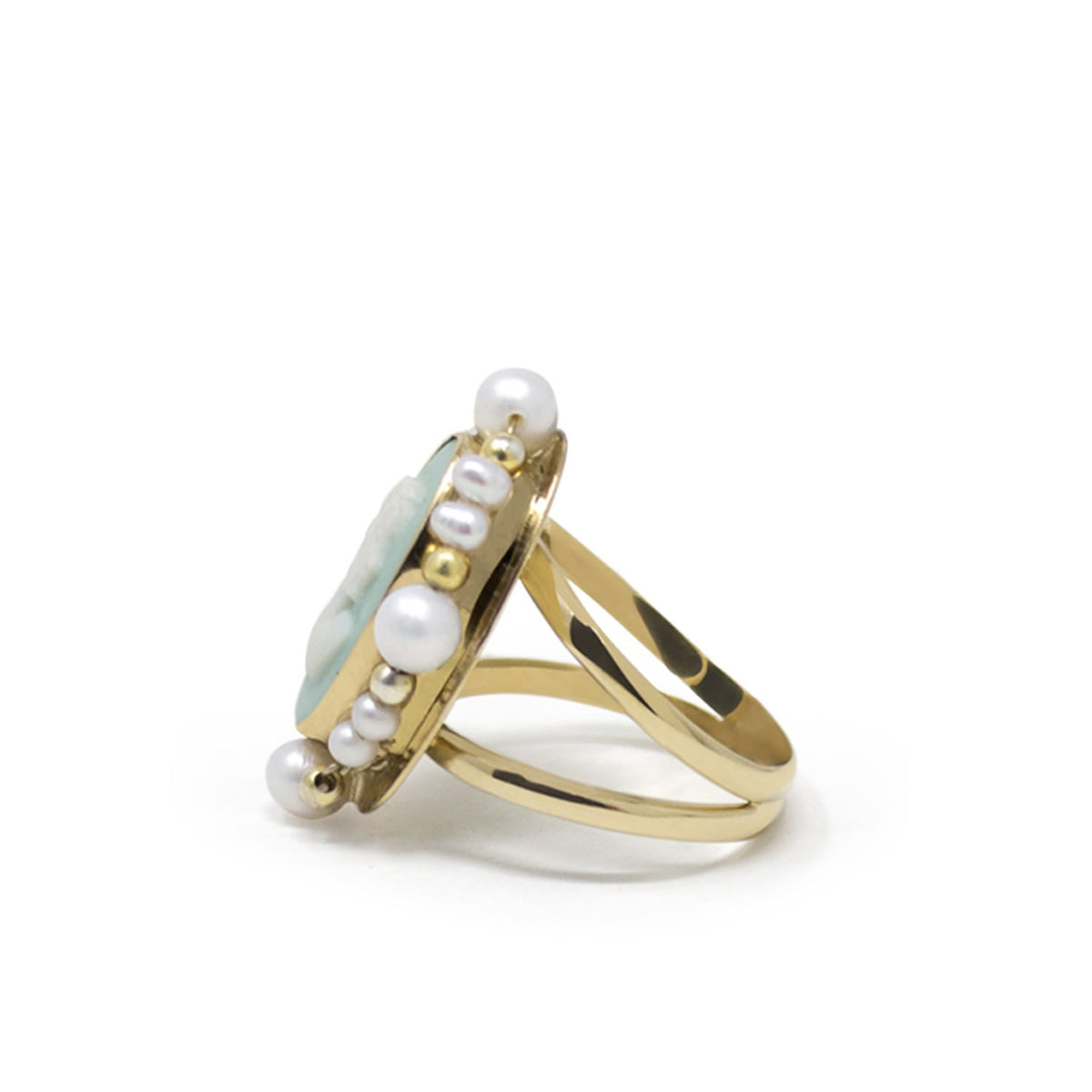 This ring is handmade from recycled 18-karat gold over sterling silver (1-micron thickness) with a 0.10-micron palladium plate. It features a hand-carved porcelain cameo and mismatched freshwater pearls. The piece is made in Torre del Greco, Italy.