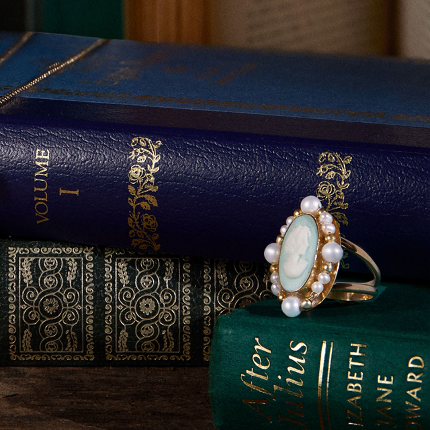 This Ophelia Gold-Plated Green Cameo And Pearl Ring by Vintouch Italy is a beautifully handcrafted ring inspired by jewelry from the late 19th century. Expertly made in Italy from recycled gold over sterling silver, it features a hand-carved porcelain green cameo surrounded by mismatched freshwater pearls. This exquisite piece blends historical elegance with a modern, artistic sensibility, making it a timeless addition to your collection.