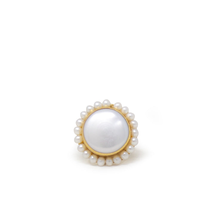 This ring is handmade from 24-karat gold vermeil over sterling silver (1-micron thickness) with a 0.10-micron palladium plate. It features a central Akoya pearl and a halo of freshwater pearls. The piece is crafted in Torre del Greco, Italy.