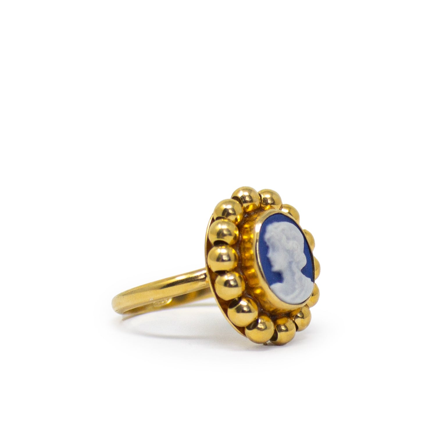 This handmade ring is crafted from 18-karat gold-plated silver (1-micron thickness) with a 0.10-micron palladium plate. It features a hand-carved blue porcelain cameo and a beaded design. The piece is made in Torre del Greco, Italy.