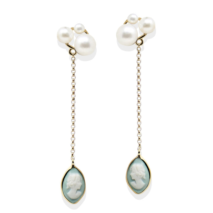 These handmade earrings are crafted from recycled 18-karat gold over sterling silver (1-micron thickness) with a 0.10-micron palladium plate. They feature a hand-carved cameo and mismatched pearls. The piece is made in Torre del Greco, Italy, and is nickel-free.