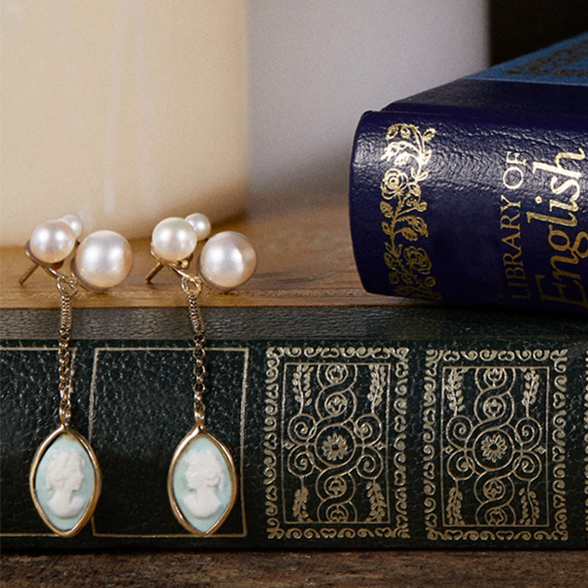 The Lilith Gold-Plated Green Cameo And Pearl Drop Earrings by Vintouch Italy are a unique and distinctive piece. Handmade in Italy from recycled 18-karat gold over sterling silver, the earrings feature a hand-carved cameo and mismatched, lustrous pearls. Presented in plastic-free packaging, they represent a new and interesting way to arrange cameos, which are the brand's signature.