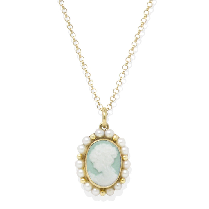 This handmade necklace is crafted from 18-karat gold over Sterling Silver (1 micron thickness) with a 0.10 micron palladium plate. It features a hand-carved green porcelain cameo and freshwater pearls. The necklace has an adjustable length of 18''+2'' and is nickel-free. The piece is made in Torre del Greco, Italy.