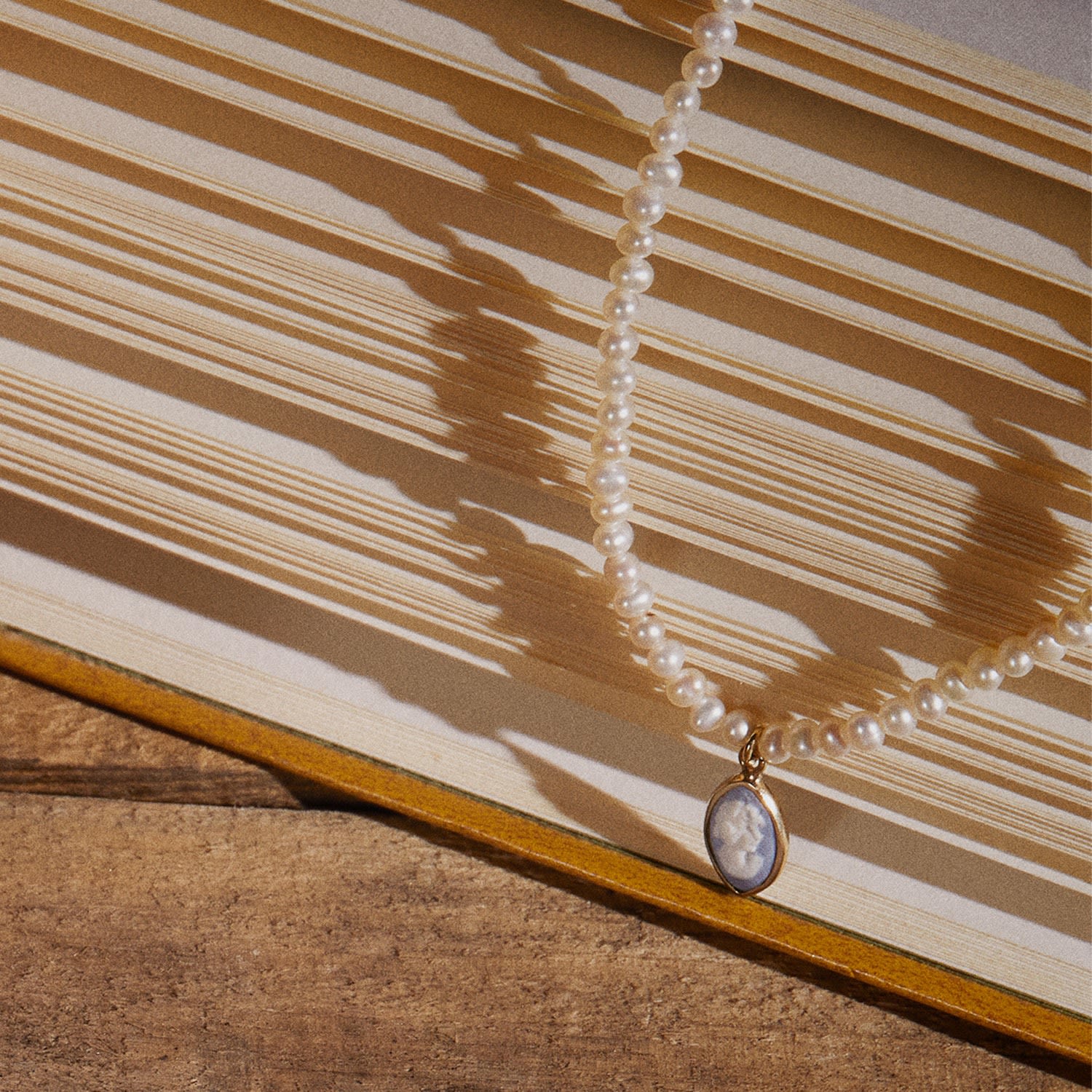 This handmade necklace is crafted from 18-karat gold-plated recycled silver (1-micron thickness) with a 0.10-micron palladium plate. It features a hand-carved sky blue porcelain cameo and freshwater pearls. The piece is made in Torre del Greco, Italy.
