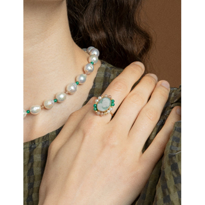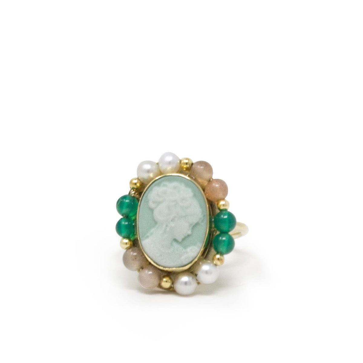 This handmade ring is made from 18-karat gold-plated silver (1 micron thickness) with a 0.10 micron palladium plate. It features a hand-carved green porcelain cameo and is embellished with pink labradorite, green agate, and freshwater pearl beads. The piece is crafted in Torre del Greco, Italy, and is nickel-free.