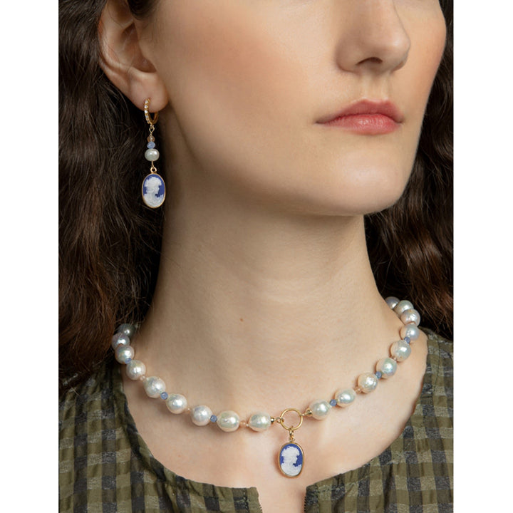 This handmade necklace is made from 18-karat gold over Sterling Silver (1 micron thickness) with a 0.10 micron palladium plate. It features Akoya baroque pearls, tiny blue agate and pink labradorite beads, and a hand-carved blue porcelain cameo. The piece is crafted in Torre del Greco, Italy, and is nickel-free.