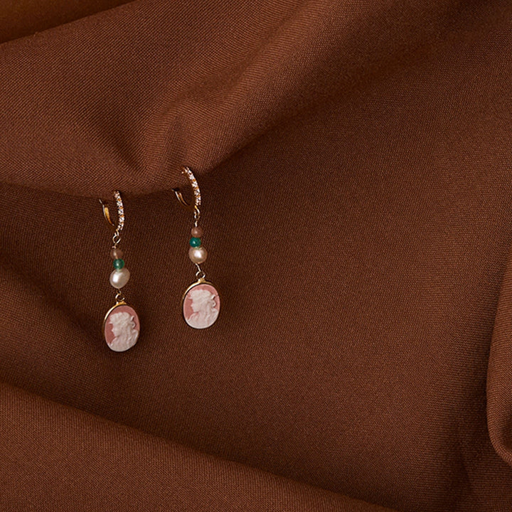 These handmade earrings are made from 18-karat gold over Sterling Silver (1 micron thickness) with a 0.10 micron palladium plate. They feature pink labradorite, green agate, and freshwater pearls, as well as a hand-carved pink porcelain cameo and white zircons. The pieces are crafted in Torre del Greco, Italy, and are nickel-free.