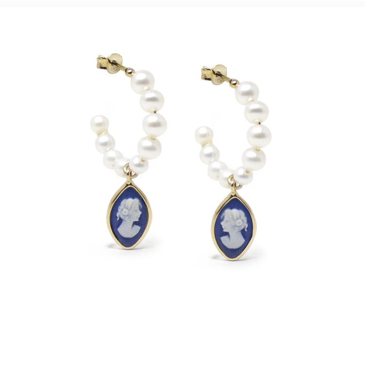 These handmade earrings are made with recycled 18-karat gold over sterling silver (1-micron thickness). They feature freshwater pearls and a hand-carved blue porcelain cameo. The pieces are crafted in Torre del Greco, Italy, and are nickel-free.