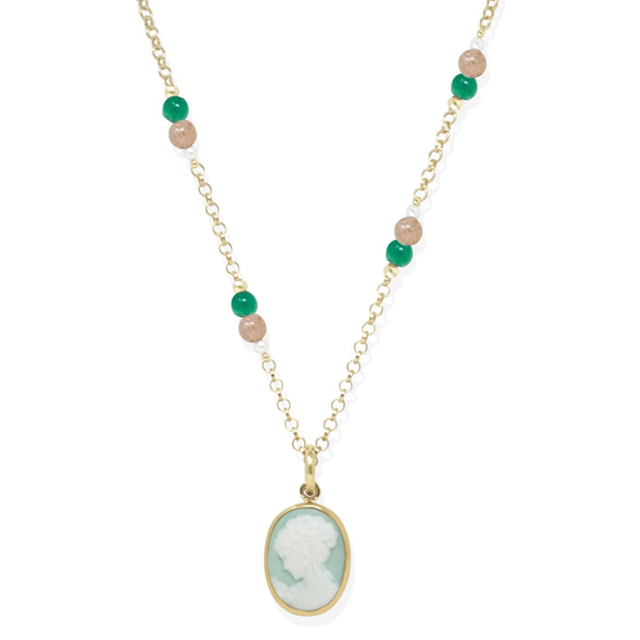 This handmade necklace is made with 18-karat gold over Sterling Silver (1 micron thickness) with a 0.10 micron palladium plate. It features a pale green porcelain cameo, green agate, freshwater pearls, and pink labradorite beads. The piece is crafted in Torre del Greco, Italy, and is nickel-free.