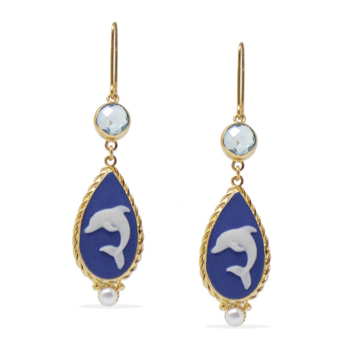 These Dolphins Cameo Earrings by Vintouch Italy are a stunning, handcrafted piece inspired by Greek mythology. The elegant drop-shaped cameos feature hand-carved swimming dolphins, a symbol of wisdom and rebirth. Accented with sparkling blue topaz, these earrings add a radiant and luxurious touch that will enhance any outfit, making them a unique and meaningful statement piece.