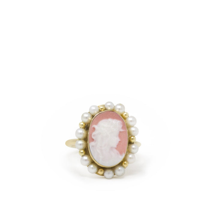This handcrafted ring is made from 18k gold-plated silver (1 micron thickness) with a protective palladium layer and features a hand-carved porcelain cameo and tiny freshwater pearls. It is entirely made in Italy and is nickel-free.
