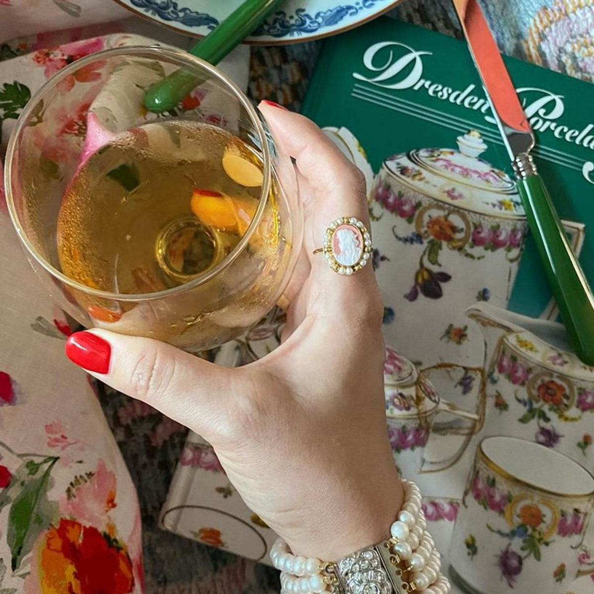 This Little Lovelies Gold-Plated Pink Cameo Pearly Ring by Vintouch Italy is a beautifully handcrafted piece inspired by the jewelry of the Victorian Age. It features a hand-carved porcelain pink cameo framed by a delicate row of tiny freshwater pearls. This ring is a perfect blend of vintage charm and modern elegance, and its thoughtful design makes it an exquisite piece for stacking or wearing alone.