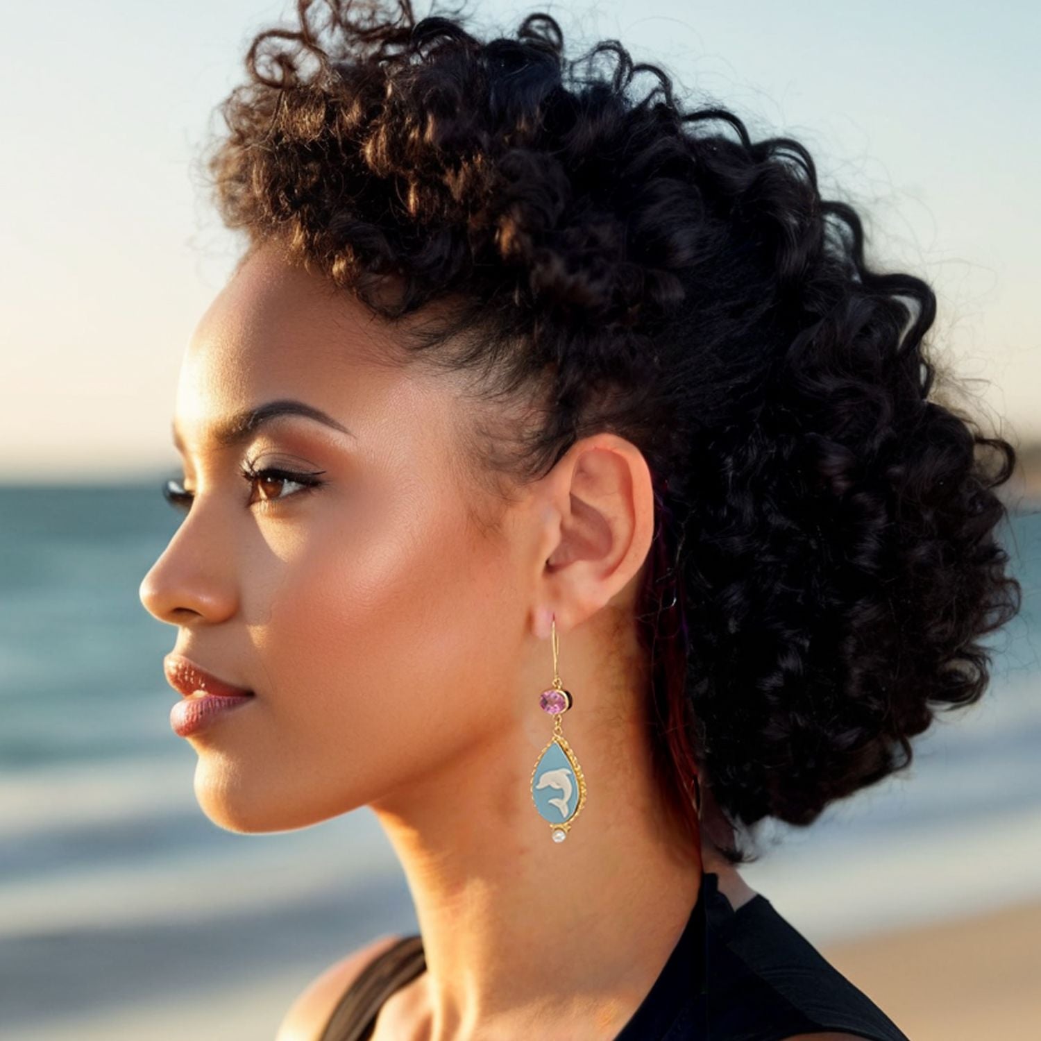 These Dolphins Cameo Earrings by Vintouch Italy are a stunning, handcrafted piece that combines mythological symbolism with artistic elegance. The elegant, drop-shaped blue porcelain cameos, which are hand-carved with swimming dolphins, symbolize wisdom and rebirth. Accented with sparkling pink quartz, these earrings add a radiant touch that effortlessly enhances any outfit.