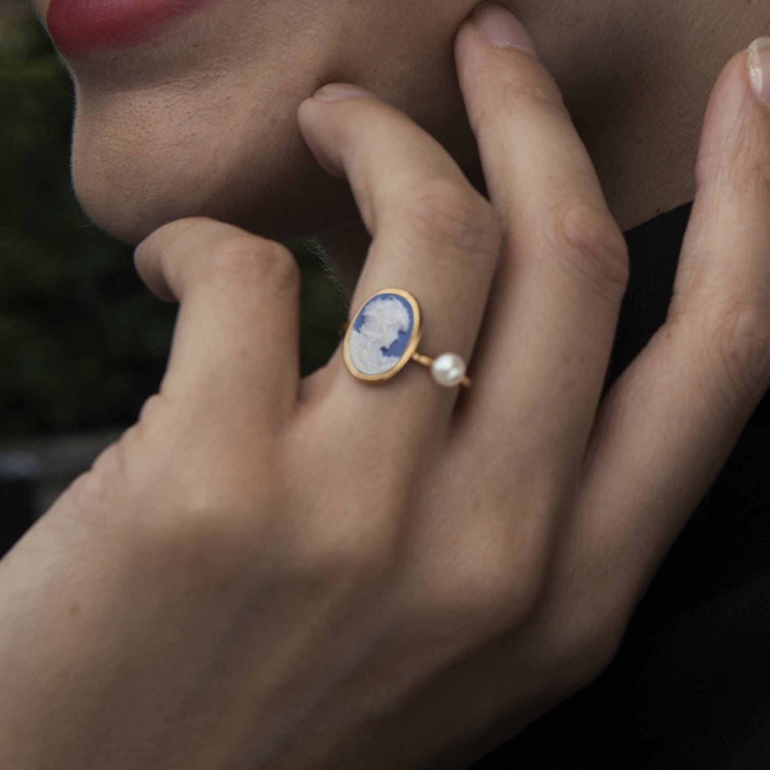 This ring is handcrafted from 18k gold-plated silver and features a hand-carved porcelain cameo and a freshwater pearl. A 0.10 micron layer of palladium is applied for protection.