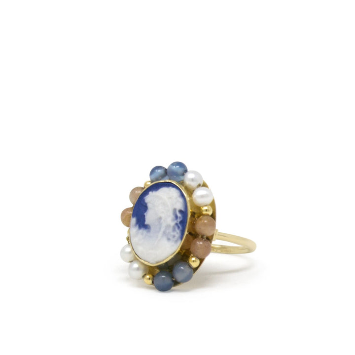 This ring is handcrafted from 18k gold-plated silver with a palladium plate layer. It features a hand-carved porcelain cameo and beads of pink labradorite, freshwater pearls, and blue agate.