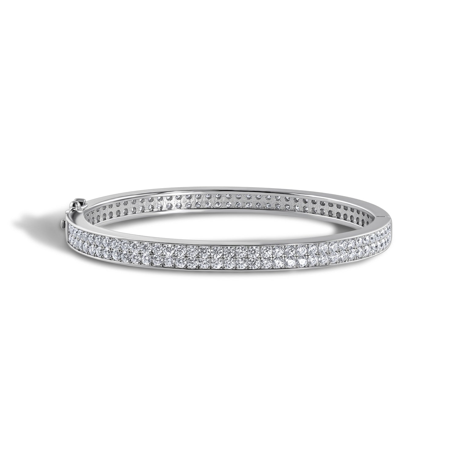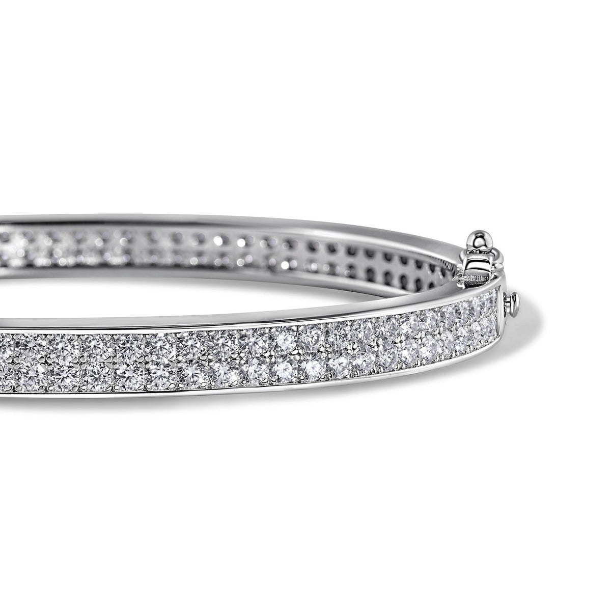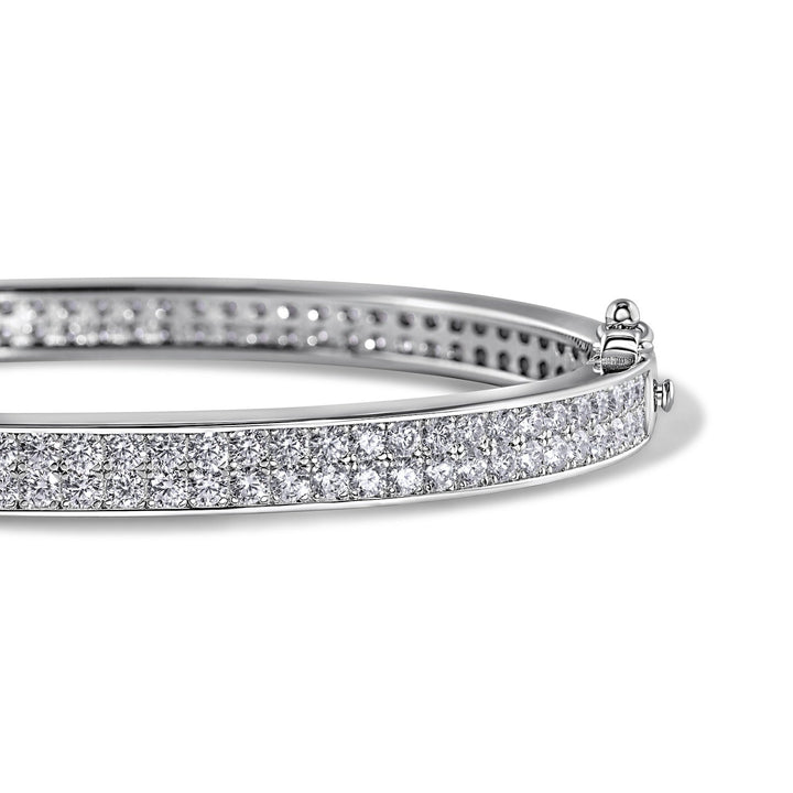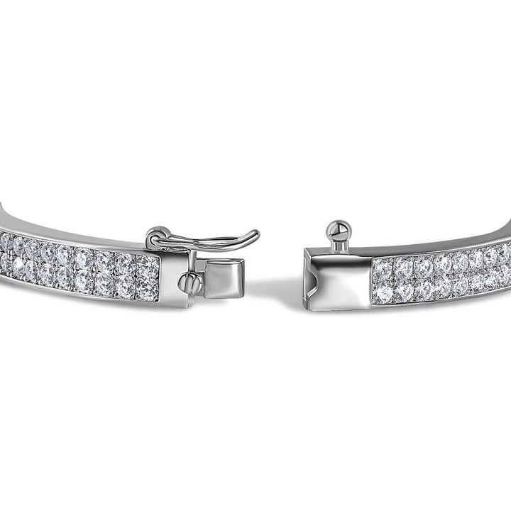 This bangle is crafted from pure sterling silver and features an eternity band of moissanite stones.