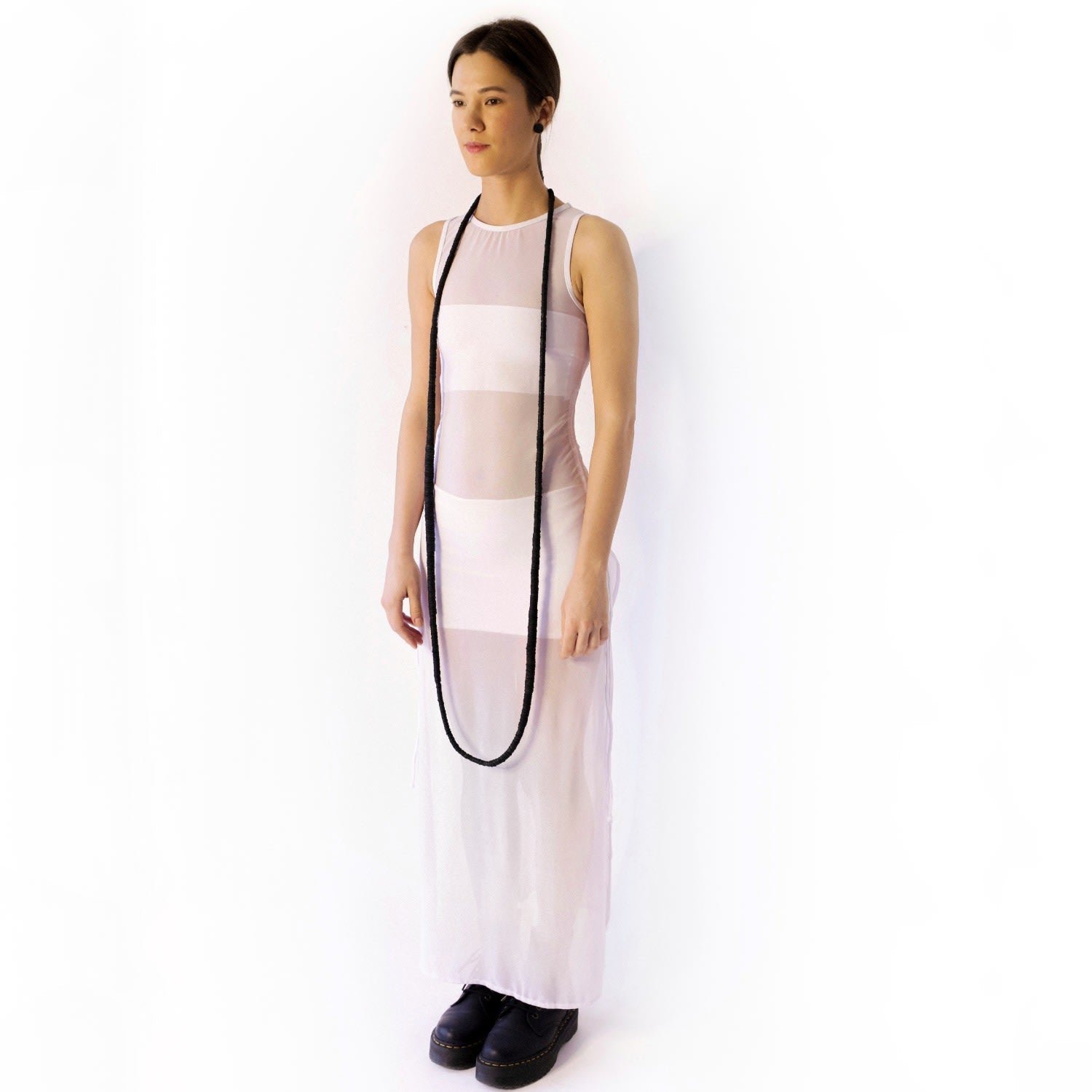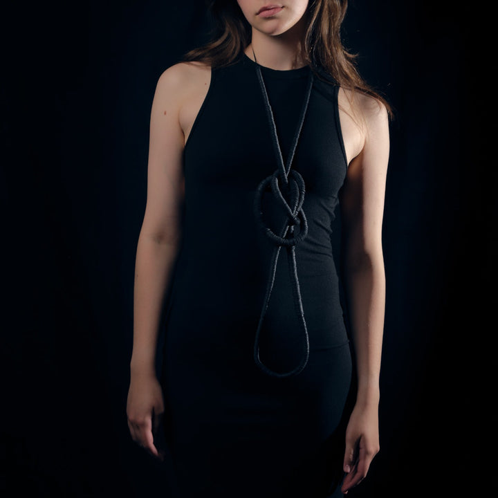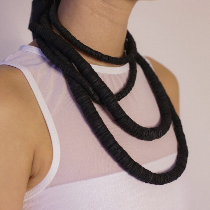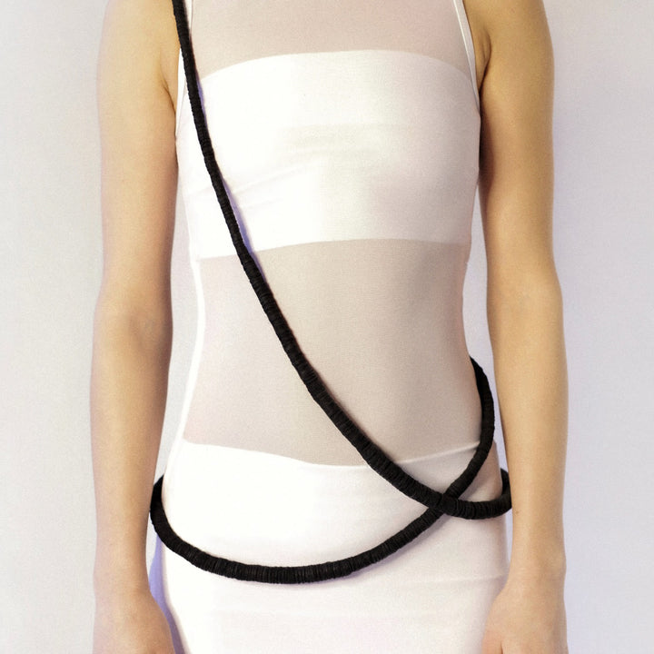 This Extra Long Leather Necklace by Waiwai is a minimalistic and modern statement piece for the trailblazer. Going against the grind, this eye-catching necklace offers endless styling possibilities. Meticulously handcrafted from individually punched leather disks, its beauty lies entirely in your hands. You can drape it, wrap it, or wear it as is, making it a customizable accessory that inspires creativity and a bold sense of self.