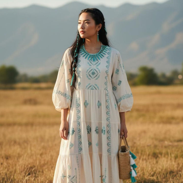 This Turquoise Spike Necklace And Freshwater Pearl Earrings Set – Boho Statement Jewelry by Way to Chic is a bold and graceful set that captures the essence of the sea. The choker features turquoise spikes and is complemented by matching freshwater pearl earrings. The set brings a vibrant pop of color and timeless elegance, perfect for summer outfits or seaside occasions.