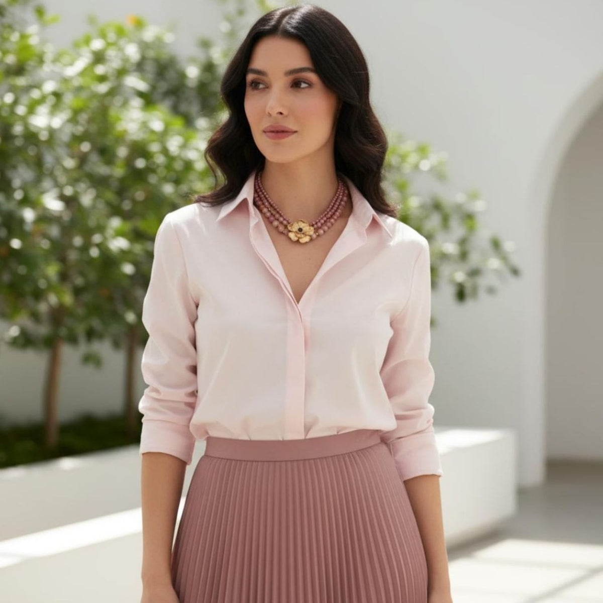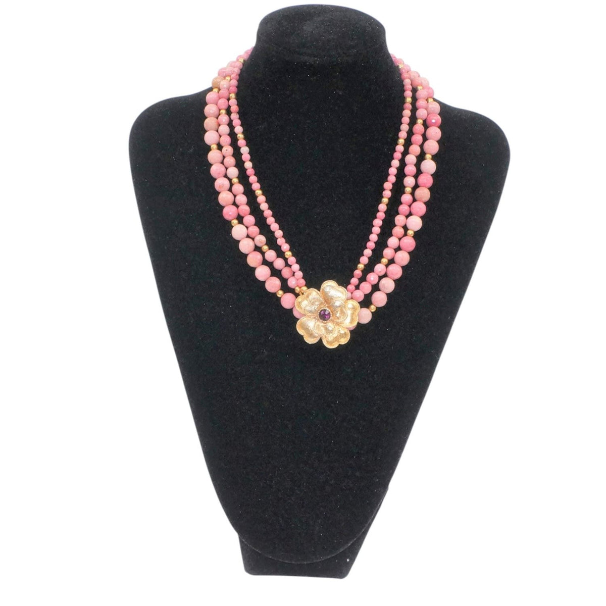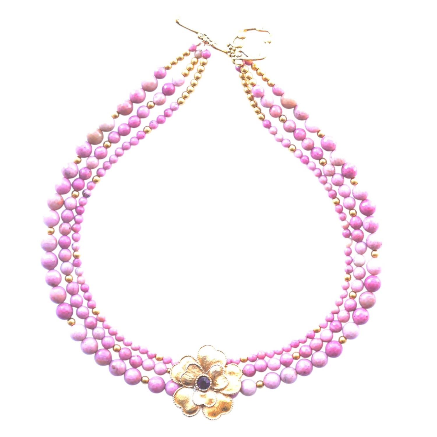 This Blush Bloom Rhodonite Necklace by Way to Chic is a truly romantic and sophisticated piece. Three strands of delicate rose and blush rhodonite gemstones cascade beautifully, leading to a vintage flower brooch centerpiece. The brooch, with its velvet-like texture and sparkling gemstone, blends old-world charm with modern elegance. It's a treasured adornment perfect for special occasions, symbolizing timeless beauty and grace.