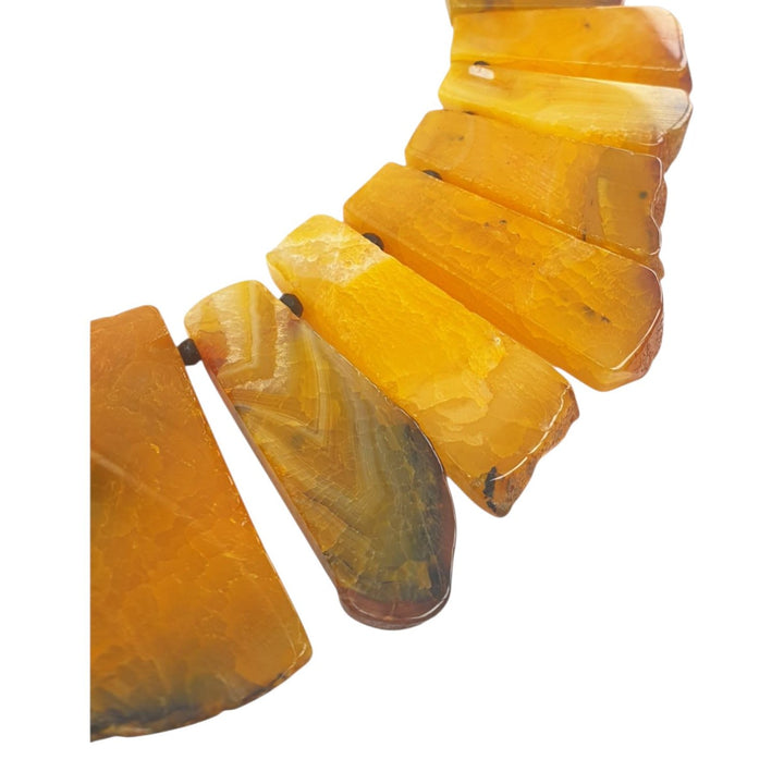 This Golden Earth: Statement Necklace Of Yellow Agate & Black Malaysian Jade by Way to Chic is a bold and sculptural piece of wearable art. Hand-cut slices of radiant yellow agate, reminiscent of golden sunsets, are complemented by polished beads of black Malaysian jade. This stunning necklace commands attention with its dramatic silhouette and organic textures, making it perfect for a runway look or any moment that calls for unforgettable presence.