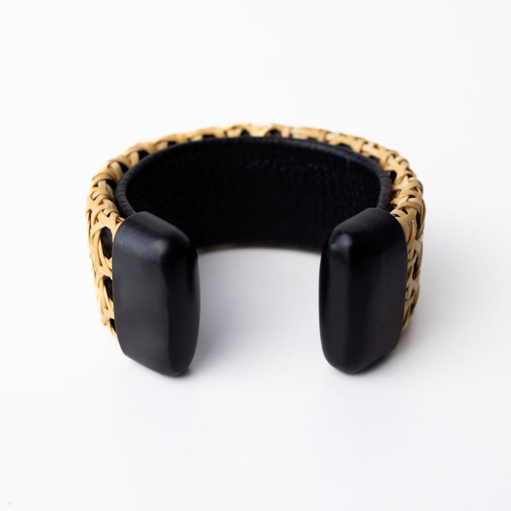 Cane cuff with Italian leather base and hand-carved wooden ends. Available in black finish.